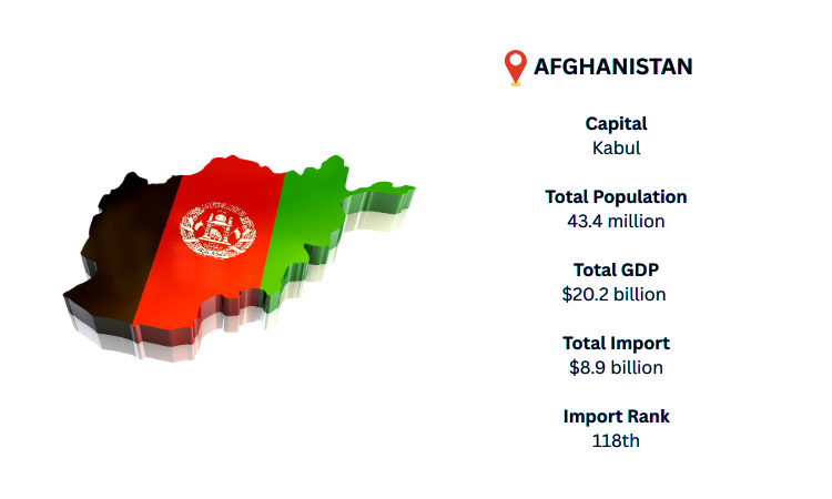 Afghanistan is a landlocked nation in South-Central Asia that shares borders with China, Iran, Pakistan, Turkmenistan, Uzbekistan, and Tajikistan. Kabul is its largest city and capital. Afghanistan's GDP is projected to be at USD 20.2 billion in 2024. Afghanistan is the 118th-largest importer in the world, according to global import data. Pakistan is the largest exporter to Afghanistan, per the most recent data. An estimated USD 8.9 billion would be imported into Afghanistan in 2024. As per Afghanistan import data, refined petroleum is the most imported product out of the vast array of commodities that are imported.