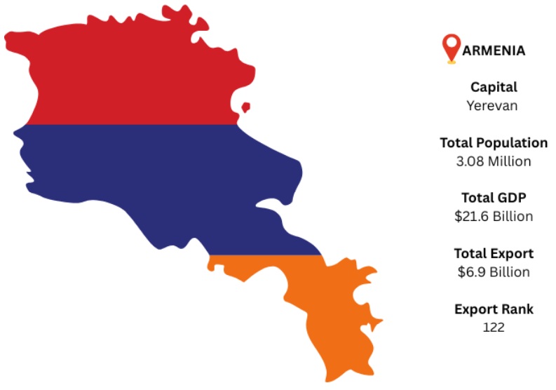 In the South Caucasus area of Eurasia, Armenia is a landlocked nation that shares borders with Georgia, Iran, Azerbaijan, and Turkey. The capital and largest city of the country, Yerevan, serves as a major center for politics, business, and culture. It is projected that Armenia's GDP would amount to USD 21.6 billion in 2024. In terms of exports, Armenia is ranked 122nd in the world. In 2024, Russia will be the largest buyer of Armenian commodities. As per Armenia export data, it is estimated that Armenia's overall export value in 2024 would be around USD 6.9 billion. Copper ores and concentrates are the most valuable export commodity that Armenia exports out of all its goods.