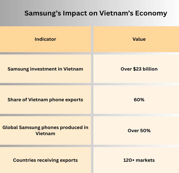 Samsung makes more than half of its smartphones in Vietnam, and the company ships phones built there to more than 120 countries across the world. The company's work in Vietnam has brought in billions of dollars in export earnings every year and has had a huge impact on the country's sectors.