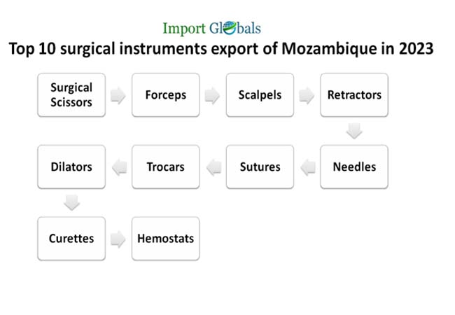As per the Mozambique Export Data, the top 10 surgical instruments exported by Mozambique in 2023 are,