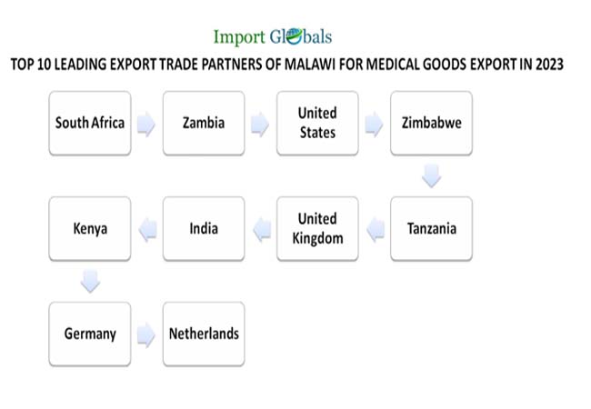 The corresponding growth rate of the country's global medical goods export according to the growing production rate of the industrial sectors has shown proactive diversity in the valuable export. According to the Malawi Trade Data, the top 10 leading medical goods export trade partners of 2023 are,