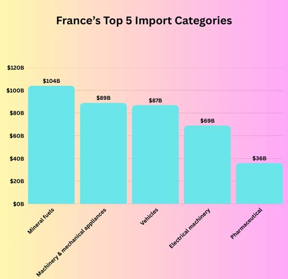 As per France Import Custom Data by Import Globals, France's greatest group of imports is HS 27, which includes mineral fuels and oils. It's not just about filling up cars with petrol at gas stations. Energy imports are important to many aspects of the economy, such as road and air transport, heating for factories, some types of energy generating and backup systems, and the petrochemical chain that creates everything from plastics to specific industrial materials.