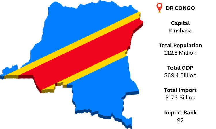 According to DR Congo Import Data, the country's total import value is projected to reach USD 17.3 billion in 2024. Ranked as the 92nd-largest importer globally, DR Congo contributes approximately 0.05% to global imports, as per DR Congo Trade Data.