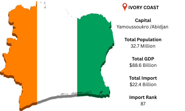 Situated on the southern coast of West Africa, Ivory Coast is formally known as the Republic of Côte d'Ivoire. It borders the Gulf of Guinea to the south, Burkina Faso and Mali to the north, Liberia and Guinea to the west, and Ghana to the east. The nation's political capital is Yamoussoukro, whereas the major city and economic center is Abidjan. As per the IVORY COAST import data, Ivory Coast is expected to be one of the fastest-growing economies in Africa, with a GDP of over USD 88.6 billion in 2024. Ivory Coast is the 87th-largest importer in the world, based on trade statistics. As of 2024, China is Ivory Coast's top exporter, demonstrating the two countries' close economic relations.