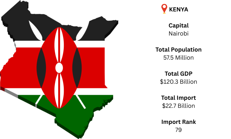 Tanzania, Uganda, South Sudan, Ethiopia, and Somalia are the countries that border Kenya, an East African nation that is situated near the Indian Ocean. Kenya's main city and capital, Nairobi, acts as the commercial and economic hub of the country. As per the KENYA import data, Kenya's GDP, which is fueled by commerce, agriculture, and services, is projected to reach USD 120.3 billion in 2024.