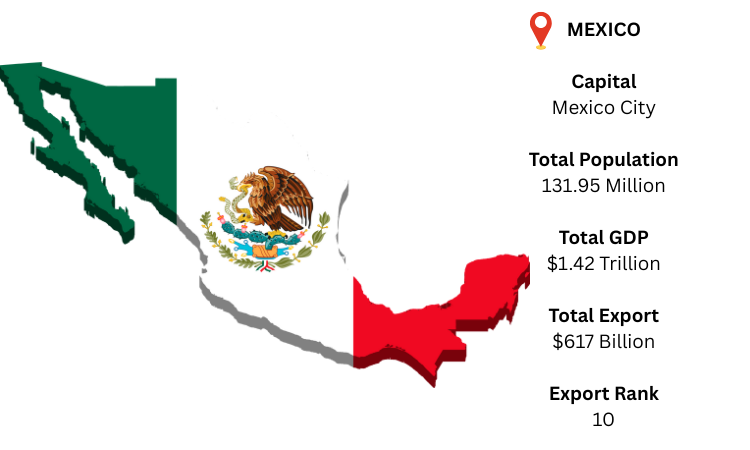 Mexico is a country in North America that shares borders with Belize, Guatemala, and the United States. Mexico City is its largest city and capital. As per Mexico export data, Mexico's GDP was over USD 1.42 trillion in 2024, placing it among the top 15 economies in the world. With total export earnings topping USD 617 billion in 2024, the highest recorded amount, Mexico ranks seventh to tenth in the world in terms of exports. With about 80% of shipments going to the US, the US is the biggest market for Mexican exports. Automobiles and car components will be Mexico's leading export product category in 2024, making up almost 25% of total exports.