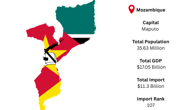 With Maputo as its capital, Mozambique is a developing nation on Africa's southeast coast with a GDP of about $17.05 billion (2024). Due to a lack of industrialization, the nation is heavily reliant on imports for manufactured products, food, gasoline, and machinery. It has a population of 35.63 million. In 2024, as per Mozambique import data, Mozambique’s overall imports reached USD 11.3 billion, demonstrating continuous growth fueled by infrastructural development and energy-related expenditures.