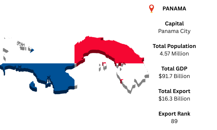 Panama is a country in Central America that borders both the Caribbean Sea and the Pacific Ocean. It is bordered by Colombia and Costa Rica. Panama City, its capital, is a major international financial and logistical center driven by the Panama Canal. Panama's GDP came to over USD 91.7 billion in 2024. As per Panama export data, exports of products totaled USD 1.16 billion, and exports of services, mostly transportation and travel, added USD 15.1 billion, for a total of USD 16.3 billion. Fish and seafood (worth USD 194 million), fruits and nuts (worth USD 185 million), and oils and fats (worth USD 106 million) were Panama's top exports. Panama's biggest export destination for products was the United States (about 19%), followed by the Netherlands and India.
