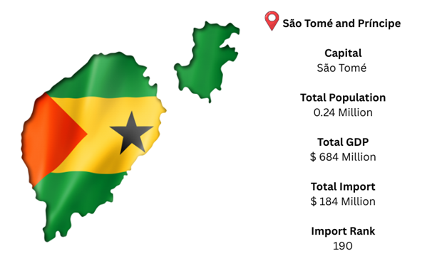 São Tomé serves as the capital of São Tomé and Príncipe, a tiny island republic in Central Africa's Gulf of Guinea. As per São Tomé and Príncipe Import Data, due to its low capability for domestic manufacturing, the economy is dependent on imports. Its GDP is around USD 684 million, while its merchandise imports came to almost USD 184 million.