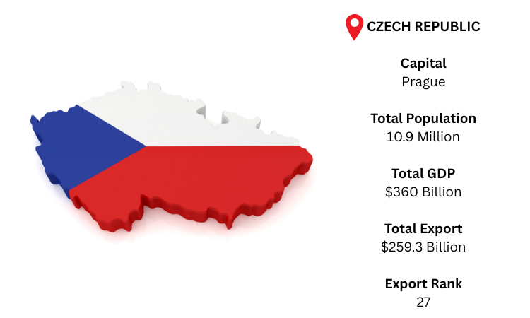 With a solid foundation in machinery, electrical equipment, and automobiles, the Czech Republic has a significant industrial economy in Central Europe. The capital, Prague, is the hub of the nation's trade and business. With a population of over 10.9 million and a GDP of nearly USD 360 billion, as per the Czech Republic export data, Czechia is expected to export USD 259.3 billion in total. Vehicles continue to be its major export product, driving economic development and EU trade connections, while Germany is its biggest export destination.