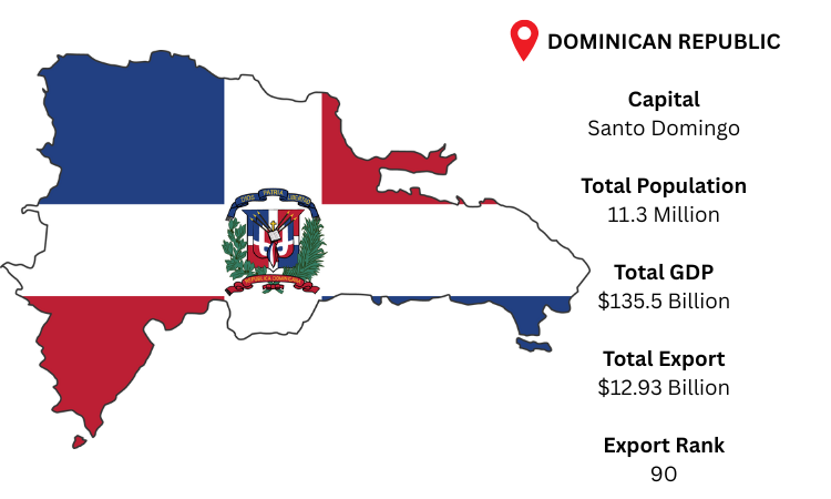 The Dominican Republic is a thriving Caribbean nation with a thriving export industry based on natural resources and free-zone manufacturing. The capital, Santo Domingo, is the hub of the country's politics and economy. As per Dominican Republic export data, the nation, which has a population of about 11.3 million and a GDP of USD 135.5 billion (2025 estimated), had record exports of USD 12.93 billion in 2024, an 8.3% year-over-year rise, fueled by growth in tobacco products, medical devices, and jewels.