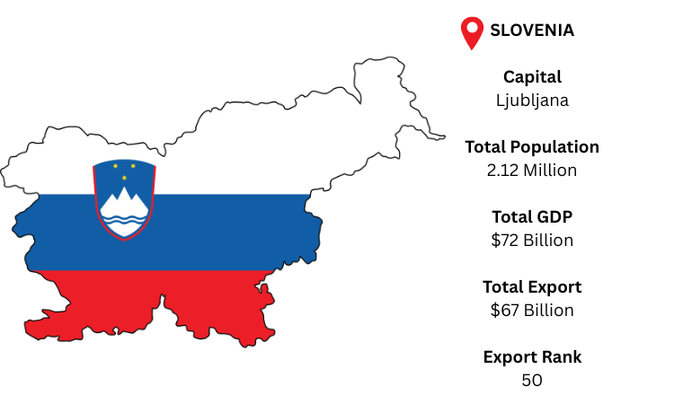 Pharmaceuticals, manufacturing, automobiles, and electronics are the main export-driven industries of Slovenia, a wealthy country in Central Europe. The capital, Ljubljana, has a population of 2.12 million and a GDP of USD 72 billion. As per Slovenia export data, with total exports of USD 67 billion, it demonstrated its significant contribution to international trade.