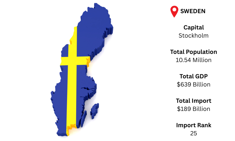 Sweden, a wealthy Nordic nation, depends on imports to sustain its energy, automotive, and sophisticated industrial sectors. The capital is Stockholm. Sweden retains a strong trading position with a population of around 10.54 million and a GDP of USD 639 billion. As per Sweden import data, a tiny trade surplus of USD 6.8 billion is produced when total imports reached USD 189.0 billion, slightly less than total exports of USD 195.8 billion.