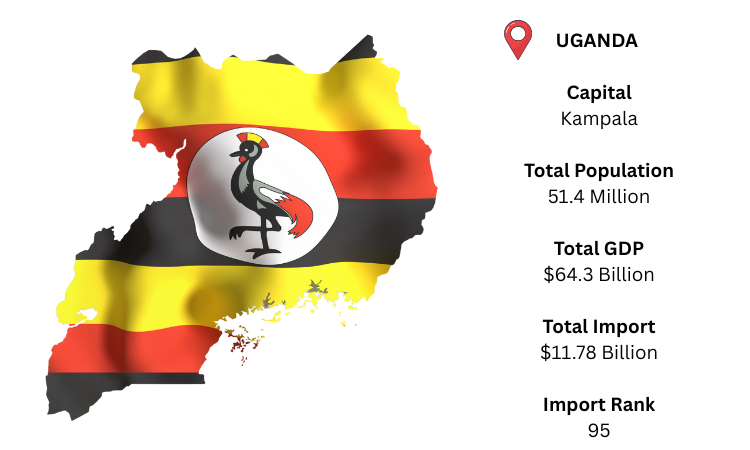 Uganda is a landlocked East African country bordered by Kenya, Tanzania, Rwanda, South Sudan, and the Democratic Republic of the Congo. Its capital city is Kampala. As per Uganda import data, the country’s GDP stood at approximately USD 64.3 billion in 2023. Uganda imported goods worth around USD 11.78 billion in 2023, driven primarily by rising demand for fuel, machinery, vehicles, and pharmaceutical products.