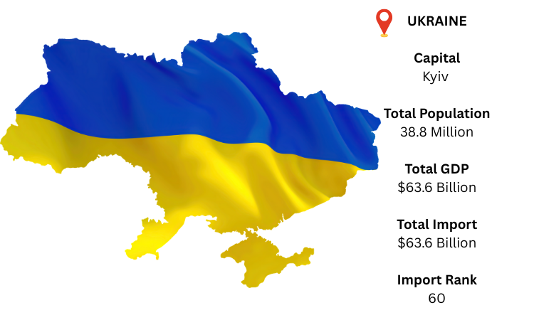 Ukraine is an Eastern European country with a population of about 33 million. The country imported approximately USD 63.6 billion, ranking around 60th globally, reflecting its ongoing industrial demand and reconstruction needs. Its capital is Kyiv. As per Ukraine import data, its import share is USD 63.6 billion, and top import partners include China, Poland, and Germany, and the leading imported products are mineral fuels, vehicles, and electrical machinery.